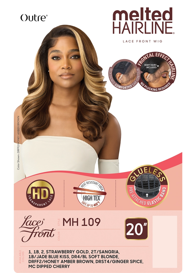 Outre Melted Hairline Glueless HD Lace Front Wig MH 109 COLOR SHOWN ON MODEL: 1B/Jade Blue Kiss, DRFF2/Honey Amber Brown, MC Dipped CherryMATERIAL: Synthetic Hair TYPE: Lace Front WigLENGTH: 20"STYLE: Wavy TEXTURE: YAKI Soft HD Transparent Lace...